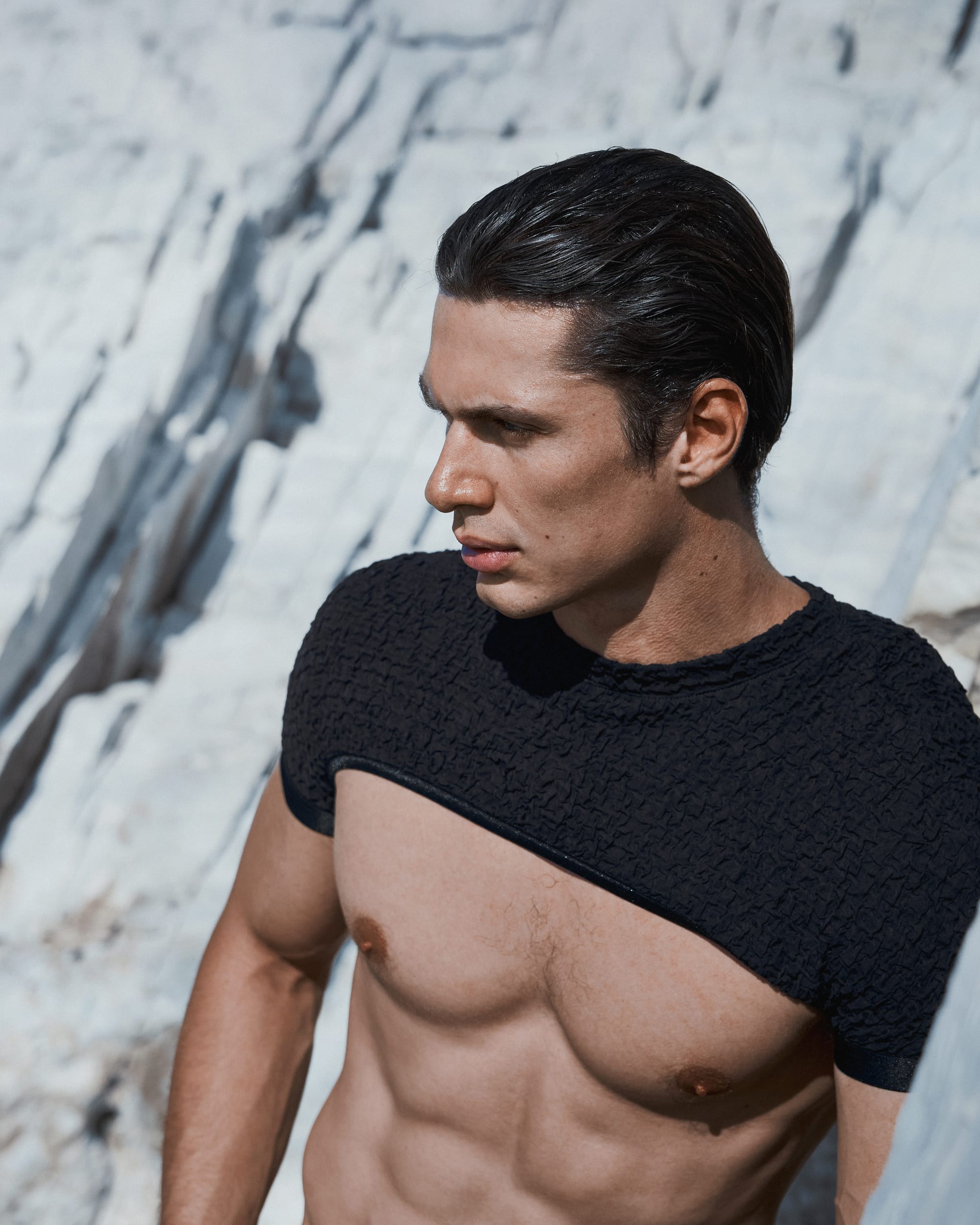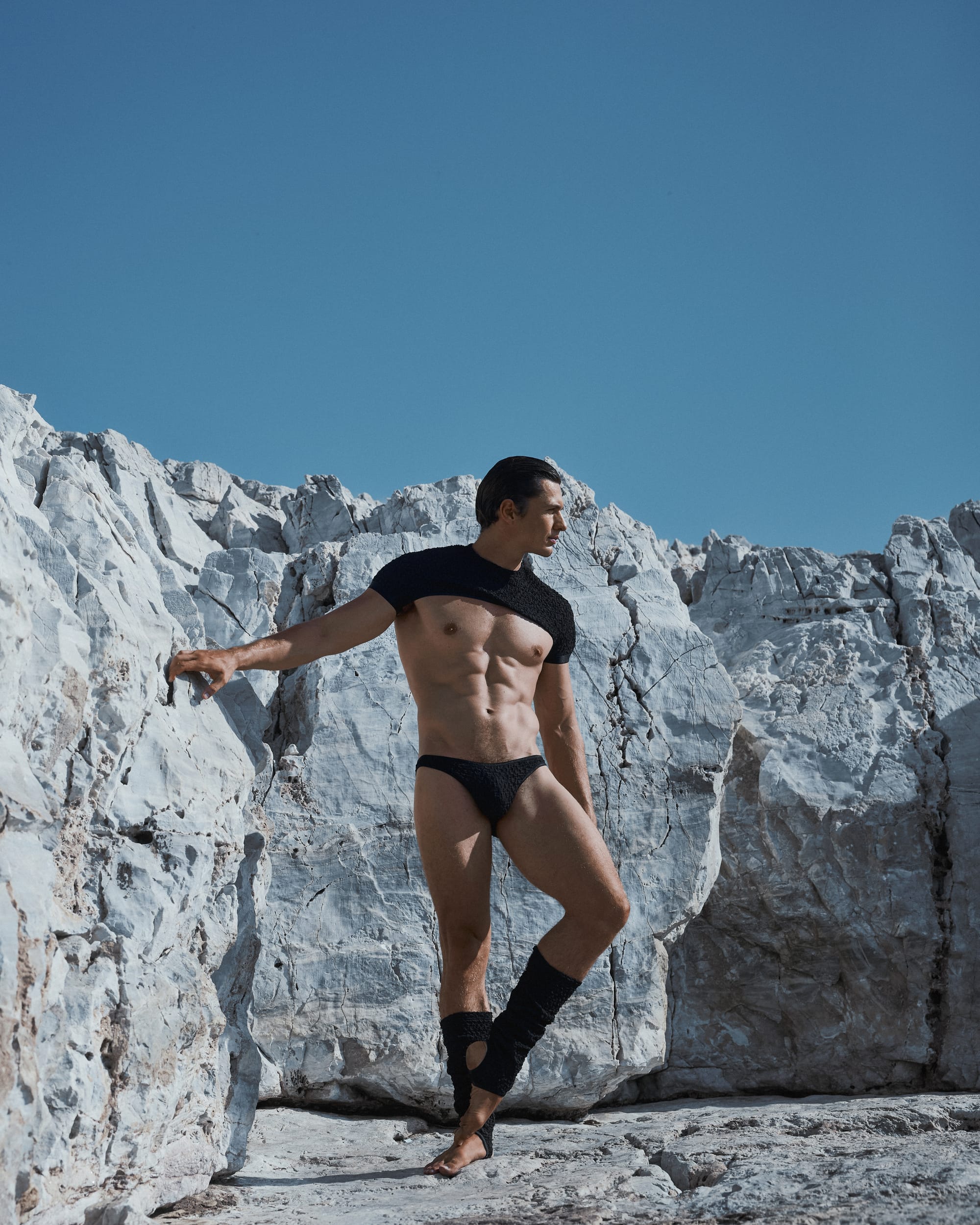 Constructed from elastic fabric with a tulle overlay, this is bodywear for the active man.