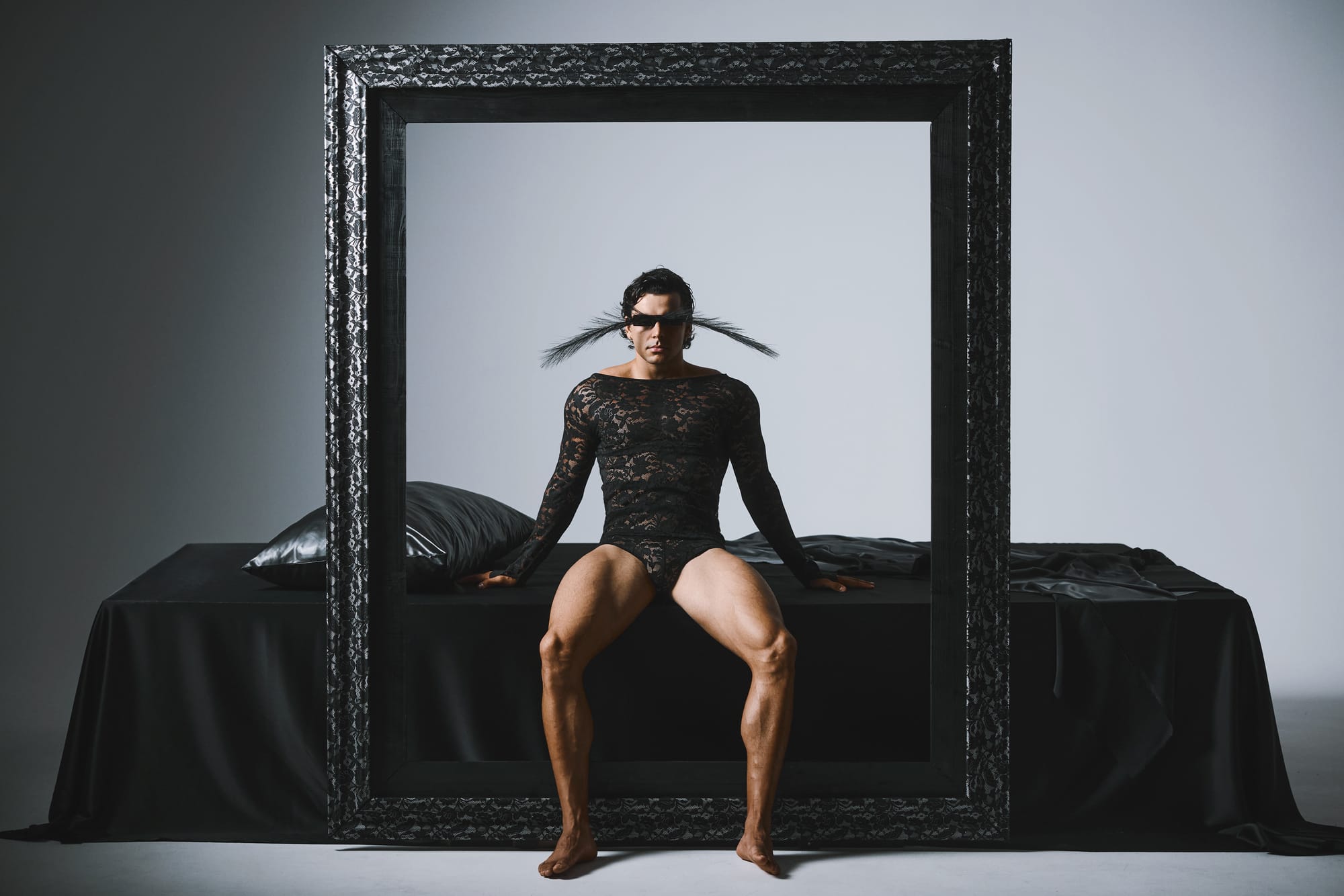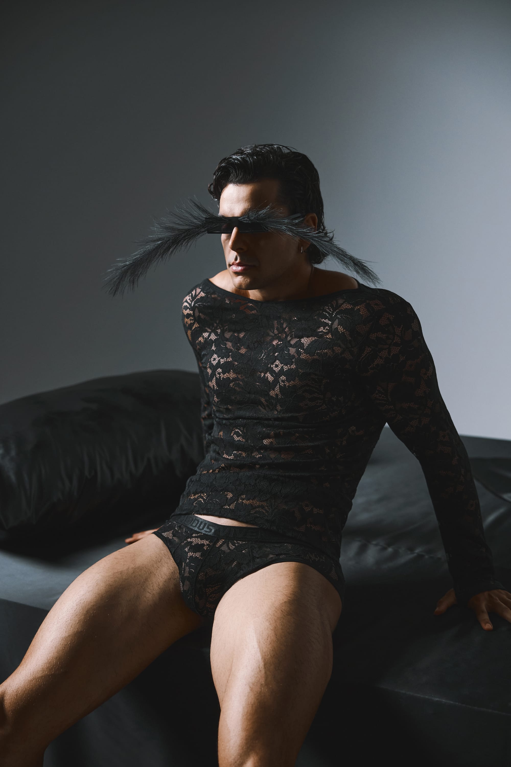 Crafted from semi-transparent knitted floral lace, the sheer black fabric enhances the floral pattern, creating a powerful visual contrast that highlights the body’s natural form while adding depth, shadow, and texture.