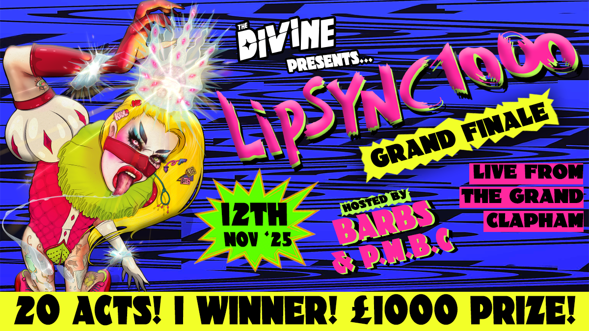 LIPSYNC1000 GRAND FINAL – Europe’s fiercest drag battle IS HERE. After 8 weeks of competition, and with over 100 of London & the UK’s finest drag performers, The Divine invites you to the SUPERSIZED grand final of its ground-breaking competition LIPSYNC1000, at the spectacular ‘CLAPHAM GRAND’. This amazing venue gives a fantastic opportunity for the 20 queer finalists to present themselves in all their finery to a roaring audience of 1200 people on the Grand’s legendary stage, fit of a King, Queen or Thing. The qualifying drag artists get FOUR MINUTES each to strut their stuff before being judged on their look, their lip-sync, and their overall star power. Who will join the LIPSYNC1000 hall of fame this year?Judges from entertainment, journalism and of course the drag scene, will cast their eye over the performers and choose the winner of the coveted LIPSYNC1000 crown and £1000 cash prize. Additional prizes include gigs with The Divine and really tacky trophies. Your hosts for the night are the cabaret powerhouse & past winner P.M.B.C plus everyone’s favourite mini-skirted pianist BARBS. But it’s not just about the money – those who have impressed at LIPSYNC1000 have gone on to have their own shows, and nights, developed at The Divine, they’ve performed at Glastonbury, Latitude, Hackney Empire, the MTV Awards and London & Brighton Pride and some have even been on Ru Paul’s Drag Race UK – all this off the back of wowing in LIPSYNC1000. So, watch this space for all this year’s future drag superstars. Tickets:Carer Ticket: FREE Low income £12 + fees Limited Early Bird £15+ fees Second release £17 + fees Third release £20 + fees Royal Box (4 people) £80 + fees Doors 6.30pmCompetition Start: 8pm prompt. Competition finish: 11pmDisco ’til 12 midnight NOTE: This is a strictly 18+ admittance Accessibility Information & requests viahttps://claphamgrand.com/accessibility