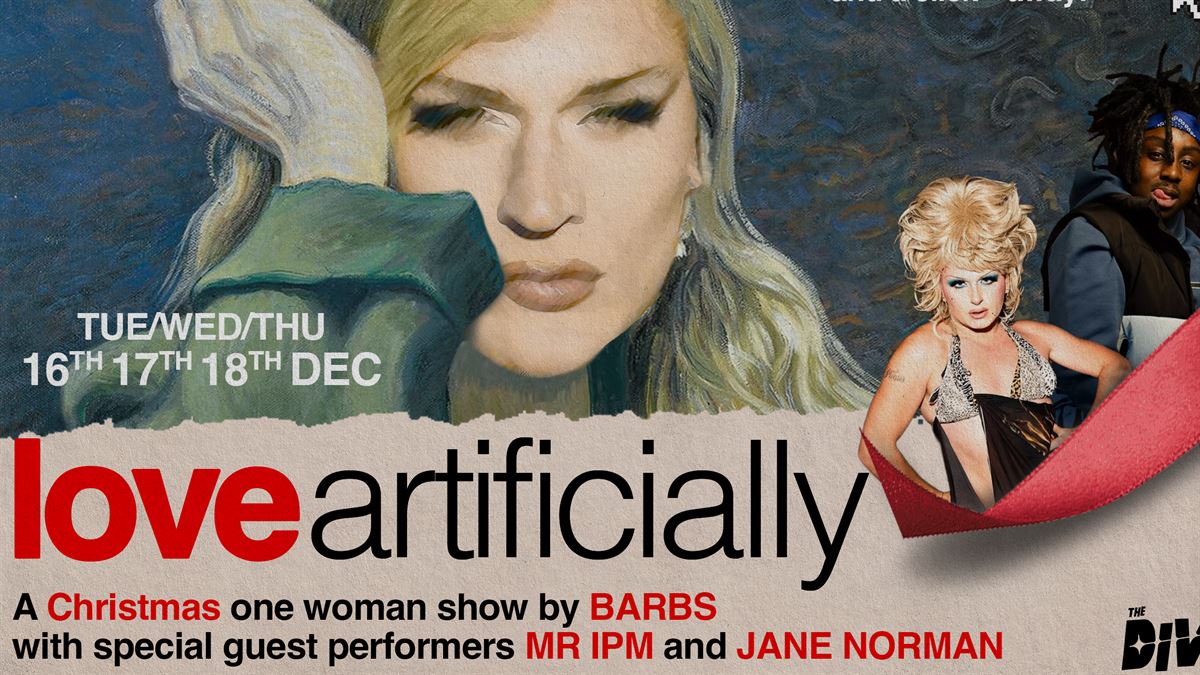 BACK BY POPULAR DEMAND. 🎁❤️Love Artificially❤️🎁In this clever and futuristic one-woman show, LOVE artificially, Barbs invites the audience into her living room for an unforgettable ‘night before Christmas’ filled with laughter, reflection, and a touch of holiday magic. ❄️Barbs has spent years in a stagnant marriage with her silent, unchanging husband—a perfect listener but, frankly, quite dull. As she reminisces about the highs and lows of their life together, she begins to question the depth of their connection. With boredom creeping in, Barbs logs onto her laptop and opens up to an unexpected friend who leads her down a spicy path. ;)🌶️Expect emotional serenades, spell-bounding performances, some shimmering piano playing and even a guest performer. Don’t miss Love Artificially, the futuristic comedy that proves love just might be a wish—and a click—away. December 16th 17th 18th@The Divine, Doors 7:30pm - Show 8pmRUN TIME 1.5hours Tickets: £15, early bird £12, £10 concession/low income (message me if you need concession)(Free Tickets for Carers are available)ACCESS INFO Sadly, both floors of The Divine are not currently accessible as we do not have a lift.- The ground floor, main bar of The Divine is accessible.- There is an accessible toilet in the main bar.- The cabaret and club space are in the basement of the venue and there isn’t a lift.- There are 17 wide steps down to the basement with handrails on either side, this is where the show will take place.- There are two sets of gender-neutral toilets downstairs, they are not wide enough for wheelchairs.If you need further information, please refer to The Divine ‘About’ page on the website. www.thedivine.co.uk or email us direct on info@thedivine.co.uk